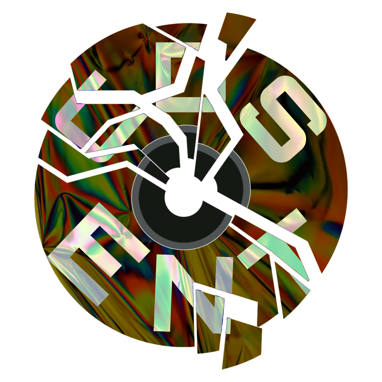 A shattered CD with the letters CDS ENT on it and colorful, iridescent textures on a clear background.